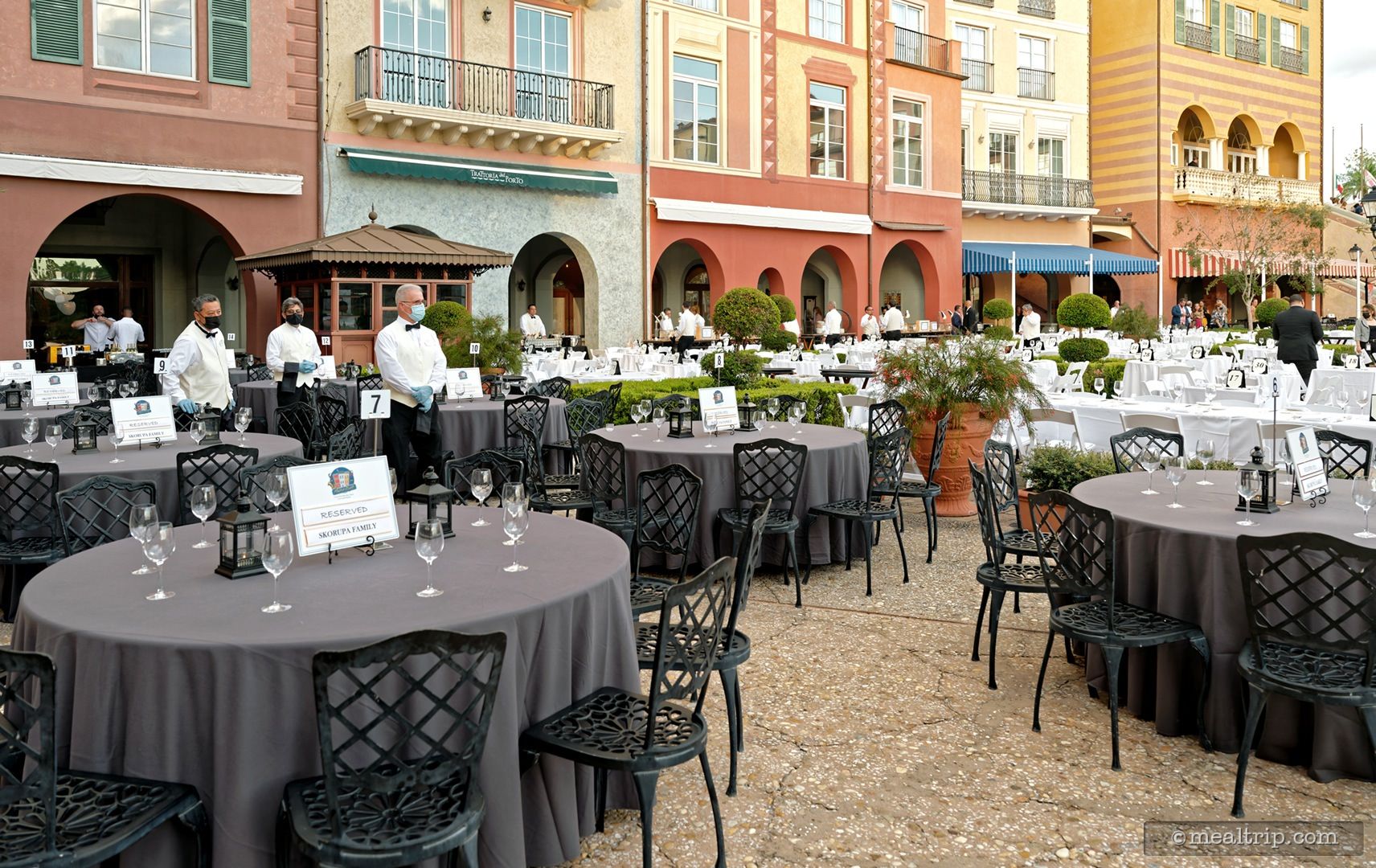 With the Individual Ticket option — open communal seating is available at very large tables. These aren't reserved seats and there's no guarantee that it will be just your part at the table. You'll have to get up and visit food and beverage stations throughout the piazza and either bring the food back to your table, or just roam around and sit wherever you see an opening.